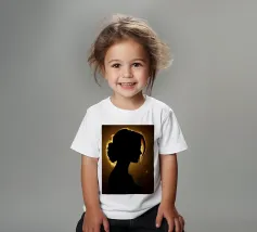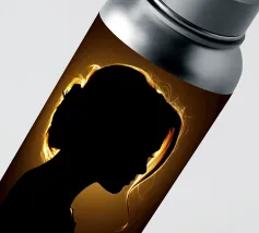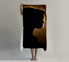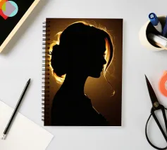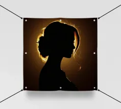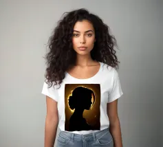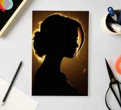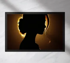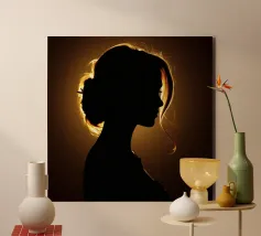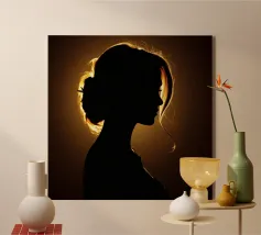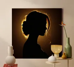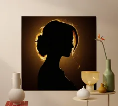 Una donna è in posa di profilo, i suoi capelli brillano sottilmente su uno sfondo caldo. La luce soffusa evidenzia i contorni della sua silhouette, creando un'atmosfera calma e sognante.