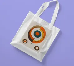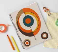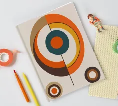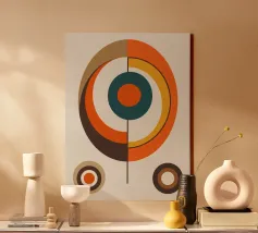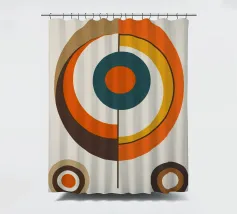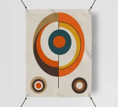 I motivi geometrici retrò presentano una disposizione di cerchi concentrici e forme intersecanti in tonalità calde come l'arancione, il marrone e il senape. Il disegno presenta un allineamento simmetrico con una linea verticale centrale, circondata da altri motivi circolari.