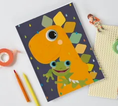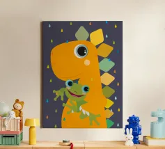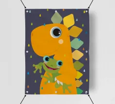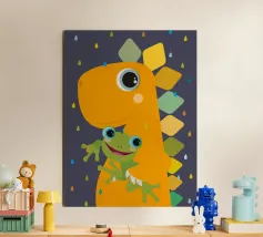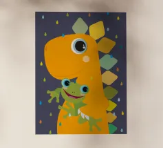 Aggiungete un tocco di colore e di simpatia al vostro spazio con questo stravagante poster con un adorabile dinosauro arancione che tiene in braccio una piccola rana verde, su uno sfondo blu vibrante con gocce di pioggia colorate e giocose. Perfetto per le camerette dei bambini, per le nursery o per chi cerca un regalo affascinante e unico per gli appassionati di dinosauri e rane, questo disegno illuminerà sicuramente qualsiasi parete con la sua allegra personalità.
