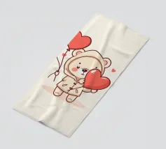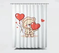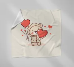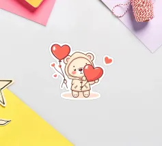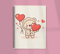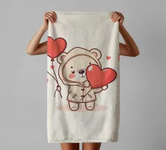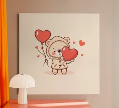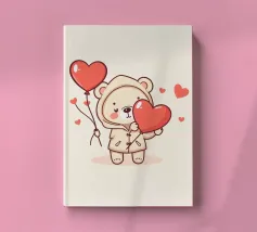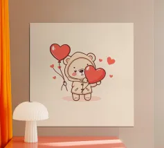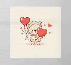 Un affascinante personaggio orso con un'accogliente felpa con cappuccio, che tiene gioiosamente in mano un grande cuore e palloncini colorati, circondato da cuori galleggianti, evocando un giocoso spirito di San Valentino.