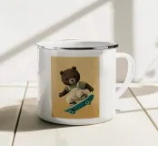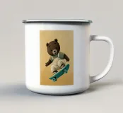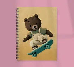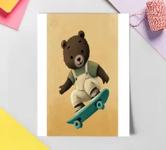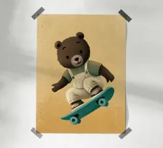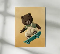 Un simpatico orsetto salta su uno skateboard, indossando una salopette color crema e una maglietta verde. Questa illustrazione calda e divertente, piena di movimento, è perfetta per la cameretta di un bambino o per un arredamento giocoso. Un disegno che unisce sport, tenerezza e spirito da cartone animato, ideale per gli appassionati di animali buffi e scene felici. Un tocco di dolce energia per ravvivare qualsiasi parete.