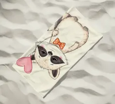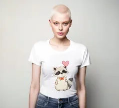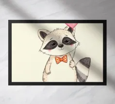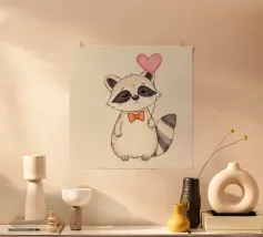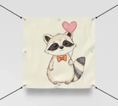 Un affascinante procione sta in piedi con un palloncino a forma di cuore in una zampa, ornato da un papillon a pois. La sua dolce espressione contribuisce a creare un'atmosfera gioiosa.