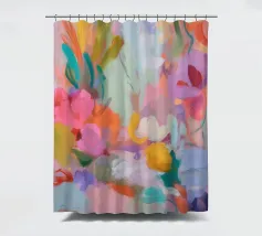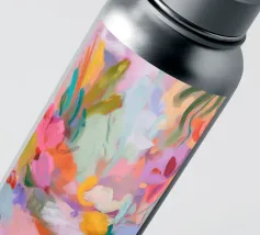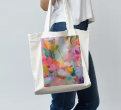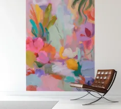 Il motivo mostra una vivace composizione floreale astratta, piena di energia e movimento. Pennellate dinamiche di rosa, arancio e verde si fondono con colori pastello tenui per creare un'arte floreale moderna. La pittura conferisce all'opera profondità e leggerezza estiva.
