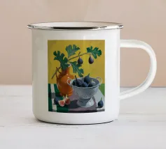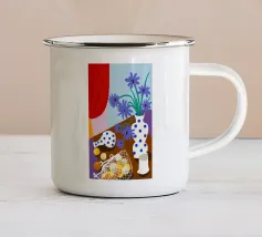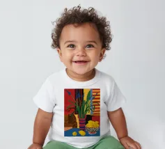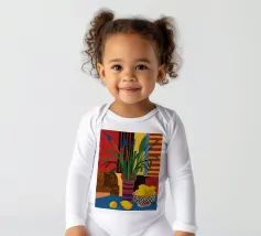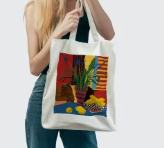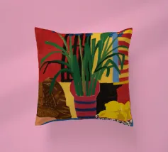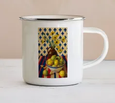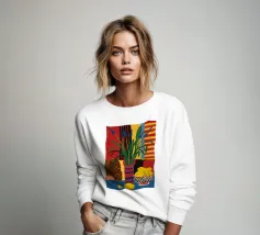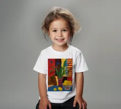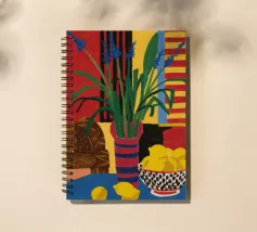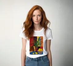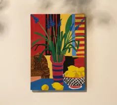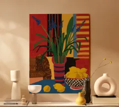 Una natura morta audace e astratta con un vaso di fiori rossi e una ciotola di limoni su un tavolo blu. Lo sfondo è una combinazione dinamica di strisce gialle e rosse, che creano una potente composizione di colori primari.