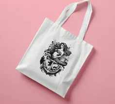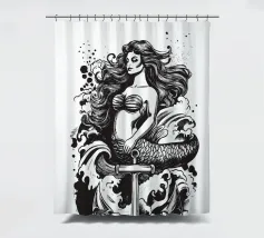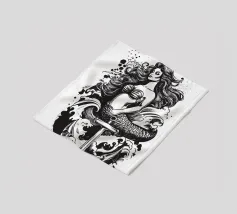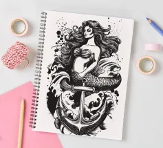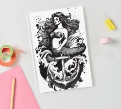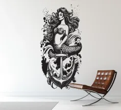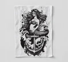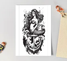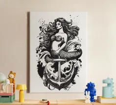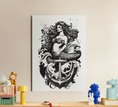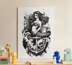 Una suggestiva opera d'arte monocromatica mostra una sirena stilizzata con capelli fluenti che si aggrappa a una grande ancora. La scena è circondata da onde dinamiche, rappresentate con intensi contrasti in bianco e nero. Questo poster combina l'estetica classica del tatuaggio con il simbolismo marittimo e conferisce a qualsiasi ambiente un'atmosfera potente e mistica.