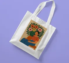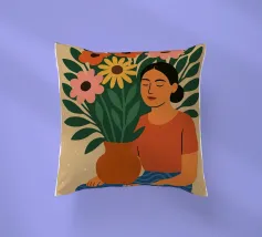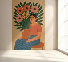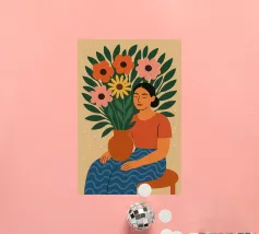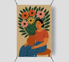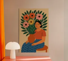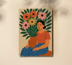 Un'illustrazione serena di una donna con un magnifico bouquet di fiori, simbolo di crescita interiore, equilibrio e tranquilla bellezza. Questo poster dona calore e armonia a qualsiasi ambiente.