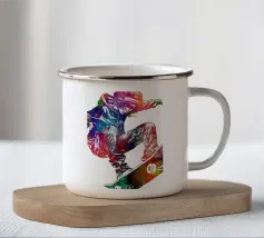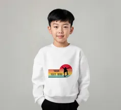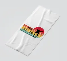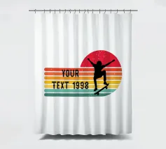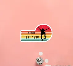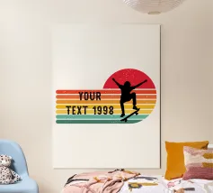 Un energico motivo skateboard dal sapore vintage: la silhouette di un pattinatore in aria, catturata davanti a un tramonto semicircolare di strisce orizzontali dai caldi colori retrò - dal rosso all'arancione al verde. A sinistra c'è lo spazio per un testo personalizzato, ad esempio "Skating since 1998", con una tipografia di grande impatto e leggermente rovinata.