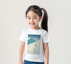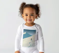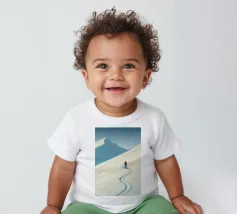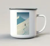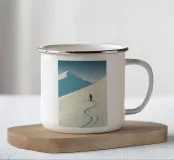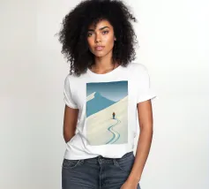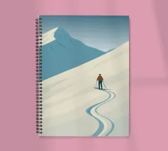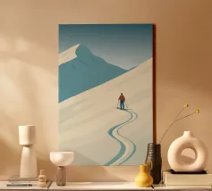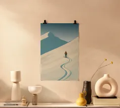 Motivo di viaggio minimalista o design di montagna con uno scialpinista che cammina sulla neve in inverno e un panorama alpino sulle montagne dell'Austria. Ideale per tutti coloro che amano la montagna e si dilettano nel touring, nel freeride o nello sci.