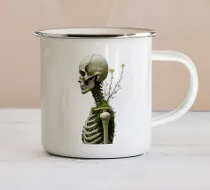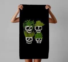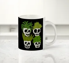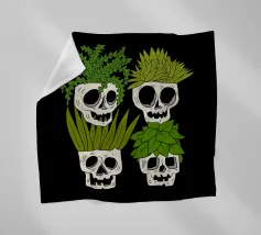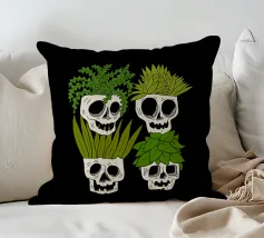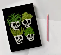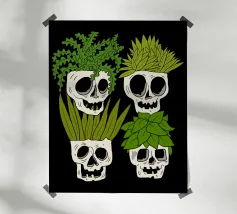 Design giocoso con eccentrici vasi a forma di teschio riempiti di rigogliose piante d'appartamento. Perfetto per gli amanti delle piante con senso dell'umorismo, questo motivo unico aggiunge un tocco di divertimento e fascino a qualsiasi spazio.