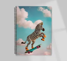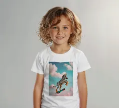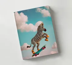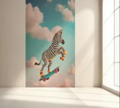 Questa vivace opera d'arte mostra una zebra giocosa che cavalca uno skateboard sopra le nuvole in un cielo luminoso e sognante. La zebra è vestita con scarpe da ginnastica arancioni, che aggiungono un tocco umoristico e stravagante all'immagine. Con un mix di elementi surreali e giocosi, questo pezzo cattura un senso di libertà e immaginazione, rendendolo perfetto per le camere dei bambini, l'abbigliamento e vari accessori divertenti. Il design colorato e fantasioso piace ai bambini e conferisce un'atmosfera edificante e avventurosa a qualsiasi spazio o prodotto.