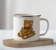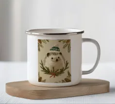 Un simpatico riccio con un cappello da Babbo Natale siede allegramente su una slitta ornata di agrifoglio. Sotto la slitta, la scritta "SLEDGEHOG" aggiunge un tocco giocoso al tema della festa.