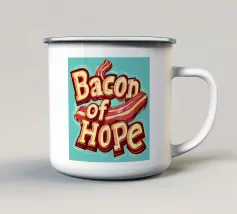 "Bacon of Hope" - uno slogan umoristico che celebra l'amore per il cibo delizioso. In lettere simili a quelle dei cartoni animati, questo slogan spiritoso risplende in blu e arancione e porta un sorriso sui volti degli amanti della colazione!