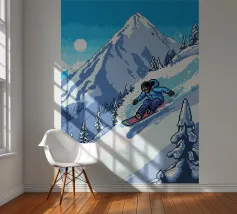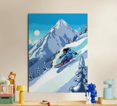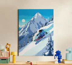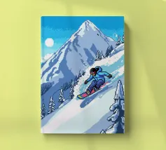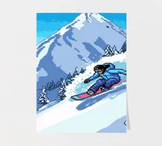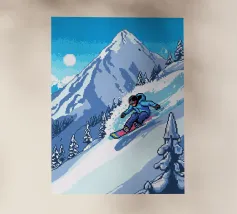 Questo disegno in pixel art cattura la magia dello snowboard nel mezzo di un ambiente alpino innevato. Il pilota taglia la polvere ad alta velocità, circondato da abeti e cime maestose. Ideale per gli appassionati di sport invernali, emozioni e pixel art vintage. Una vibrante immagine invernale, che unisce la nostalgia per i videogiochi retro e la passione per lo sci. Perfetto per tutti coloro che amano le montagne e lo stile pixelato.