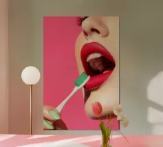 Un'esplosione di freschezza retrò con questa vibrante illustrazione pop art! Caratterizzato da labbra in grassetto, un classico spazzolino da denti pieno di pasta alla menta e un energico sfondo a strisce, questo pezzo irradia una sensazione di frizzante freschezza e di sicura igiene orale. È un'elegante strizzata d'occhio alla pubblicità vintage con un messaggio senza tempo di igiene pulita!