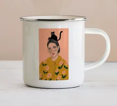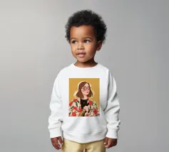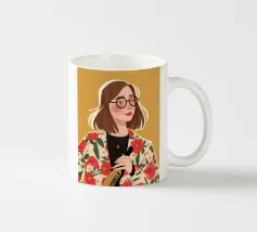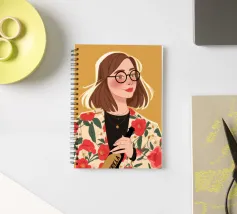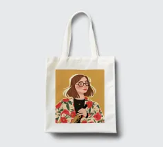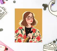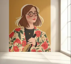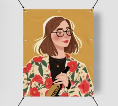 Questa opera d'arte raffigura una persona con capelli corti e biondi che indossa una giacca floreale e tiene in mano un libro. Lo sfondo giallo brillante ne esalta l'essenza chic ed elegante.