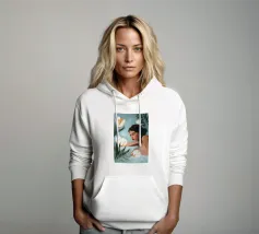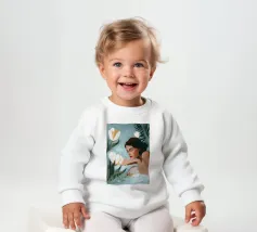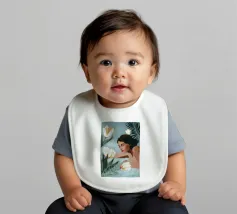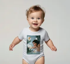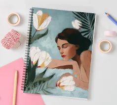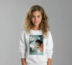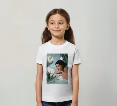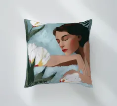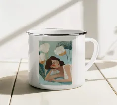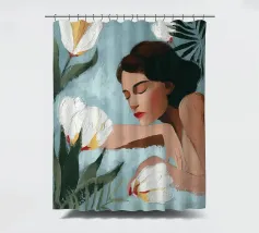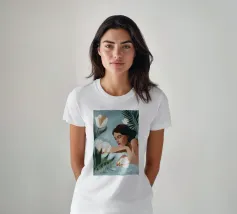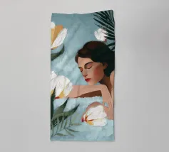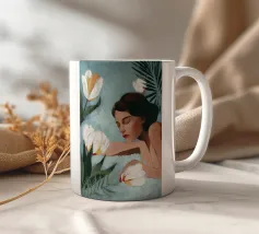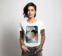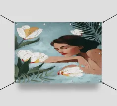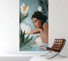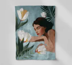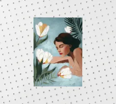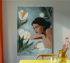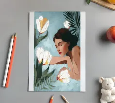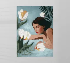 Una donna dai capelli scuri riposa con gli occhi chiusi, parzialmente immersa in una morbida acqua blu. La sua posa è pacifica, il braccio delicatamente drappeggiato sulla superficie. Intorno a lei ci sono grandi tulipani bianchi con accenni di giallo e rosso e un fogliame verde e rigoglioso. Le pennellate strutturate e i toni tenui conferiscono alla composizione una qualità sognante e tranquilla, evocando un senso di calma e introspezione.