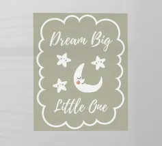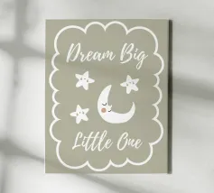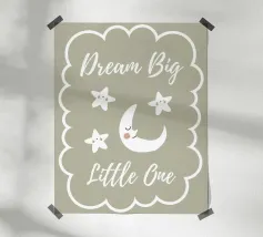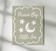 Portate un tocco di calma e dolcezza nella vostra cameretta con questa stampa minimal di luna e stelle. Caratterizzata dalla citazione "Dream Big Little One", è l'opera d'arte da parete perfetta per un'accogliente cameretta, una stanza dei giochi o come regalo per la festa del bebè.