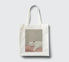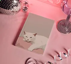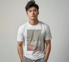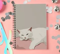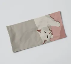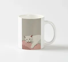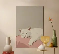 Un gatto bianco si accoccola addormentato su un morbido cuscino rosa. La palette di colori minimalista e la composizione semplice sottolineano lo stato di pace del gatto e il senso generale di calma e comfort.