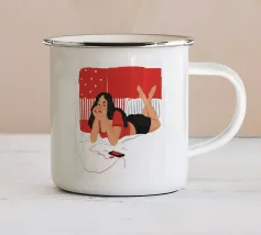 Illustrazione di una donna sdraiata in un letto con lenzuola colorate e a fantasia, che alza lo sguardo pensierosa. La scena, con la sua stanza dettagliata e il riflesso dello specchio, cattura un momento di tranquilla introspezione onirica.