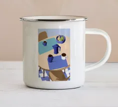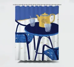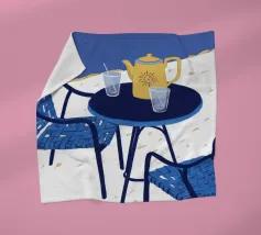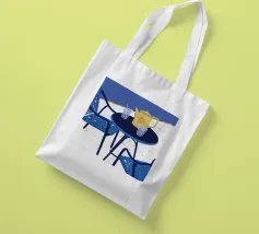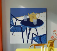 Un tavolo da bistrot all'aperto e due sedie sono resi in profonde tonalità di blu, catturando un momento di tranquillità e riflessione in un caffè in stile europeo sotto una luce fredda.