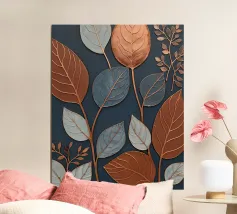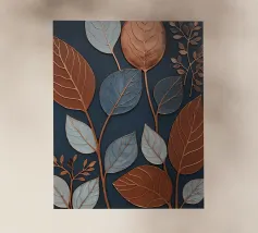 Questa accattivante opera d'arte presenta una splendida disposizione di foglie in varie tonalità di blu e rame, su un ricco sfondo blu. La texture in rilievo delle foglie aggiunge un tocco di dimensione e profondità, creando un'esperienza visiva davvero ipnotica. Questo pezzo aggiungerà un tocco di eleganza e raffinatezza a qualsiasi spazio.
