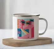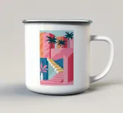 Una scena architettonica minimalista e onirica con pareti rosa, una scala blu a chiocciola e piante tropicali. Le linee pulite e i colori pastello creano un'estetica serena e moderna.