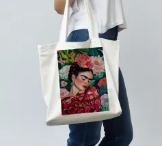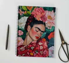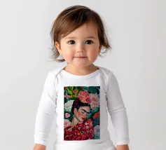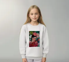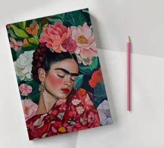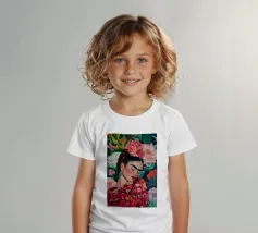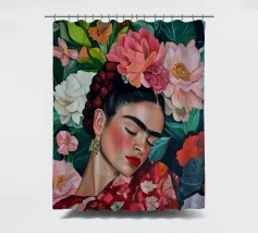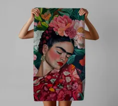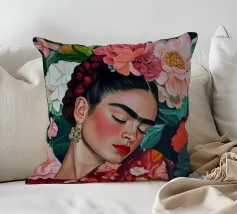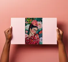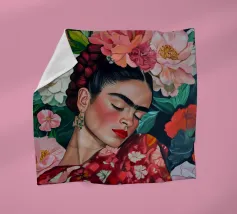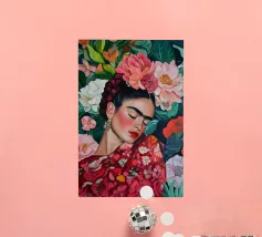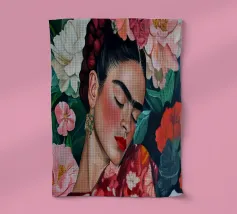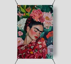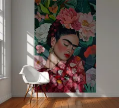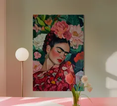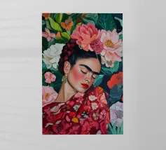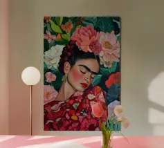 La pittura digitale moderna mostra Frida Kahlo con gli occhi chiusi, circondata da delicati colori pastello e fiori in fiore che creano un'atmosfera calma e sognante. La composizione armoniosa incarna il profondo legame dell'artista con la natura e il suo mondo interiore.