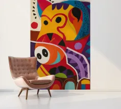 Una creatura simile a un gufo, dai tratti esagerati e dai colori vivaci, si trova su uno sfondo pieno di forme astratte e motivi viola, gialli e rossi.