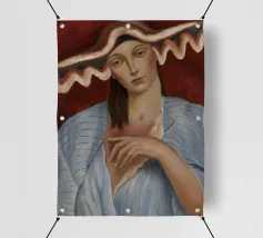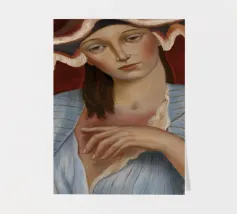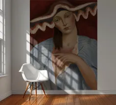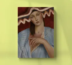 Una donna sognante, vestita di blu tenue e con un ampio cappello, guarda malinconicamente, incarnando una tranquilla eleganza.