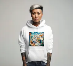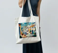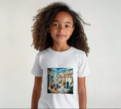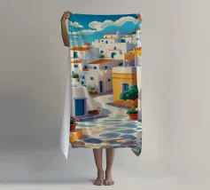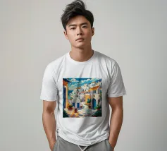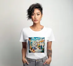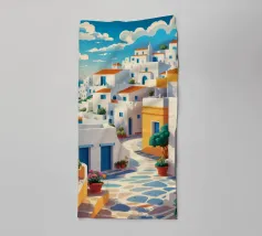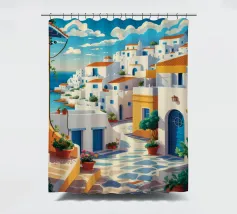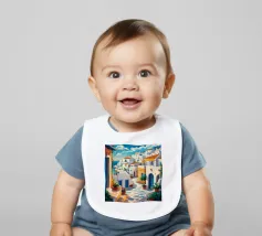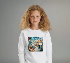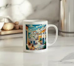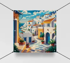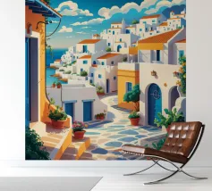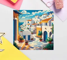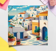 Una vista classica di architettura cicladica bianca con accenti blu, affacciata su un mare blu scintillante, sotto un cielo luminoso e soleggiato, che incarna un sogno estivo di Santorini.