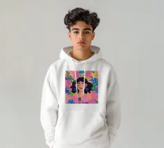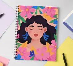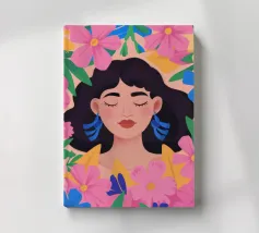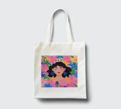 Ritratto di una donna con gli occhi chiusi, circondata da un paesaggio onirico di fiori colorati. La scena è una rappresentazione bella, serena e pacifica di un dolce sogno ad occhi aperti infuso di fiori.