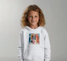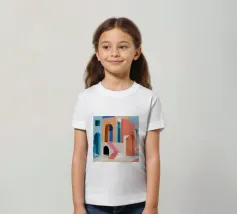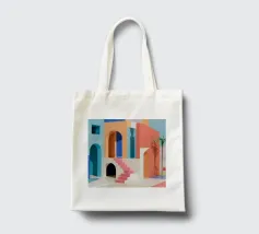 Una composizione architettonica surreale di archi, scale e porte in una morbida tavolozza pastello di rosa, blu e beige. Una palma solitaria aggiunge un tocco di natura a questo labirinto tranquillo e onirico.
