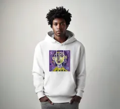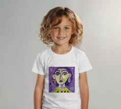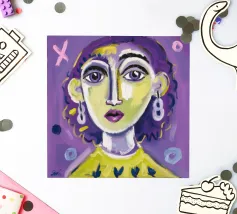 Questa opera d'arte mostra una persona con i capelli gialli e uno sfondo viola. Le forme e i motivi astratti conferiscono al dipinto una qualità onirica.
