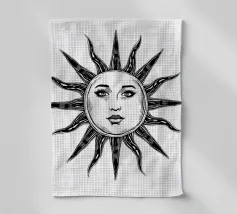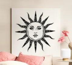 Un'ipnotica illustrazione in bianco e nero di un sole radioso dal volto umano. Gli occhi espressivi e le labbra delicate del sole gli conferiscono una presenza mistica e celestiale, mentre i suoi raggi strutturati si estendono verso l'esterno in un disegno organico e fluente. L'opera fonde simbolismo e natura, evocando temi di calore, energia e armonia cosmica.