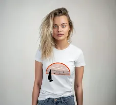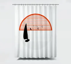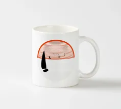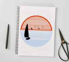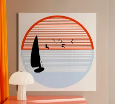 Scoprite questa illustrazione marina, un logo simile a un grande sole immaginario con sagome di uccelli e barche a vela, una scelta perfetta per tutti gli amanti della marina e della vela, ideale su capi d'abbigliamento, per uomini, donne e bambini.