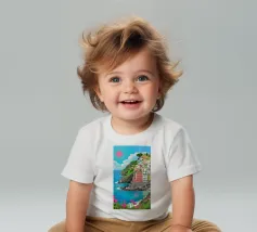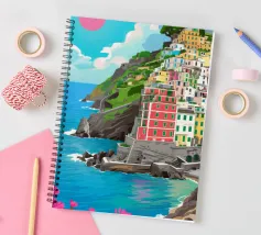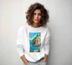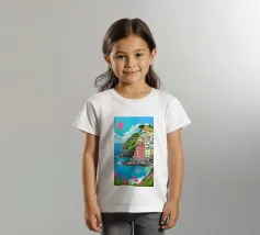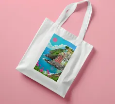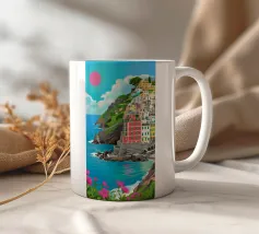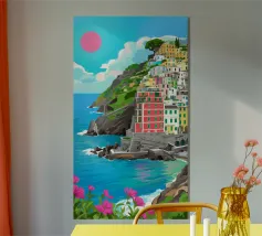 Un suggestivo villaggio bianco si trova su una scogliera rocciosa che si affaccia su un mare turchese, sotto un sole rosso brillante, con fiori rosa vibranti che sbocciano in primo piano.