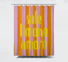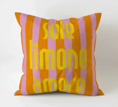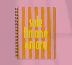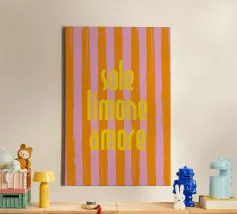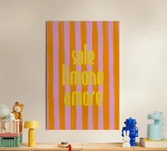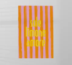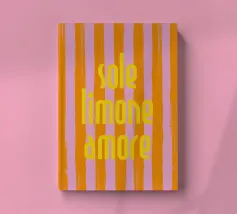 Questo poster luminoso combina la lingua italiana e i colori mediterranei per creare un design chiaro ed emozionale. La disposizione verticale delle parole "sole", "limone" e "amore", ciascuna in giallo solare su uno sfondo a strisce rosa-arancio, crea ritmo e profondità.