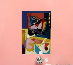 Una figura femminile siede immersa nel proprio mondo, resa con rosa tenui, arancioni e blu. Frammenti geometrici suggeriscono introspezione e ritmo interiore.