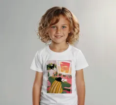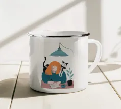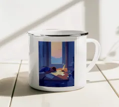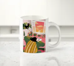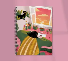 Questo dipinto raffigura una persona seduta a una scrivania con varie piante e materiale artistico. La persona indossa una camicia a quadri gialla e sembra essere profondamente pensierosa, guardando fuori dalla finestra un tramonto colorato. Un gatto nero è appollaiato sul davanzale, aggiungendo un tocco di bizzarria alla scena.