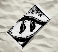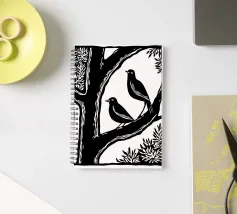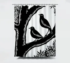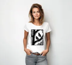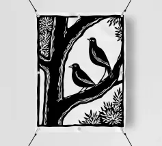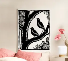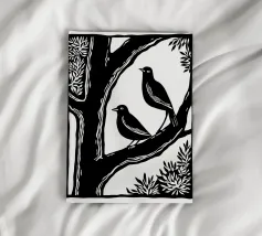 Un'audace illustrazione in bianco e nero in stile linoleografia con due uccelli appollaiati su un ramo d'albero. La composizione ad alto contrasto sottolinea l'armonia tra natura e animali selvatici, evocando un senso di serenità e compagnia.