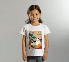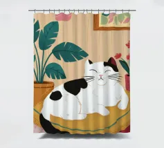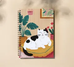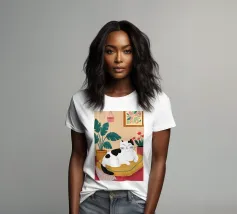 Illustrazione di un gatto nero e di un gatto bianco accoccolati insieme a forma di yin yang, che dormono su una sedia rossa. La scena è una rappresentazione dolce, affascinante e simbolica dell'armonia e dell'amicizia felina.