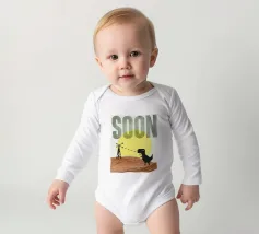 Poster tipografico divertente a tecnica mista. Dinosauro del wifi alla ricerca di una migliore ricezione. Stampa tipografica sconvolta che dice presto. Collage di grafica retrò di MsGonzalez