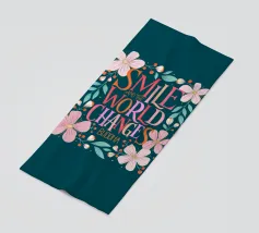 Una bella citazione positiva di Buddha, piena di gioia di vivere e di ottimismo. Incorniciata da fiori e foglie stilizzati. Molto particolare, in quanto le lettere sono state tutte disegnate a mano e non prese da font convenzionali per computer. I prodotti hanno diversi colori di sfondo, come un abricot molto chiaro, poi un abricot leggermente più scuro, un bel verde scuro e un blu scuro intenso.