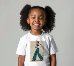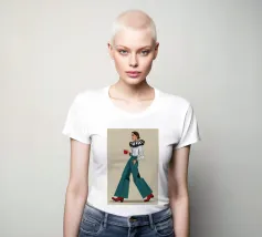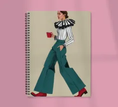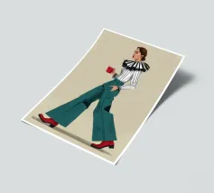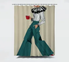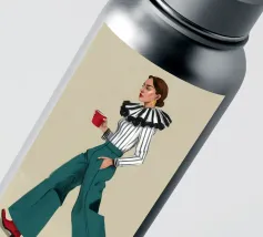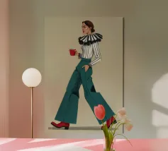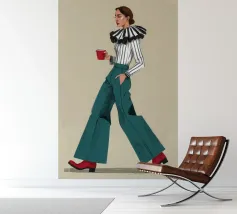 Illustrazione di moda chic di una donna con passo sicuro, che indossa un colletto a balze e pantaloni a gamba larga, mentre tiene in mano un bicchiere di vino rosso. L'immagine emana raffinatezza e stile senza sforzo.