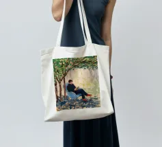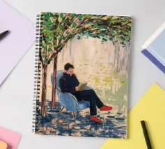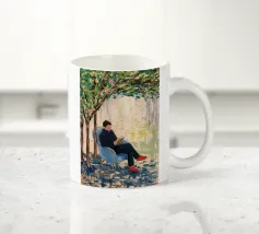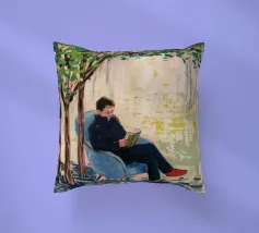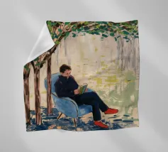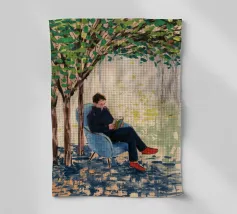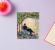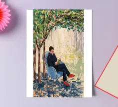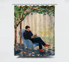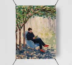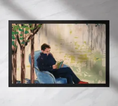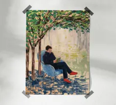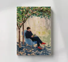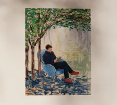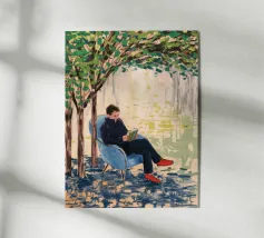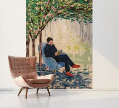 Un uomo legge tranquillamente sotto alberi arcuati, mentre la luce soffusa gioca sul terreno. Un ritratto di pace e riflessione.