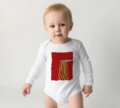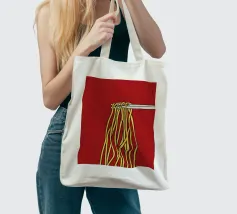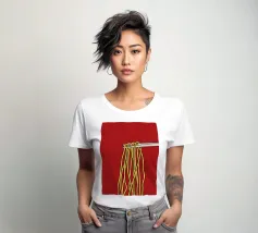 Audace e giocosa, questa illustrazione grafica pop art presenta spaghetti giallo brillante sollevati da bacchette su uno sfondo rosso vibrante: un'eccentrica celebrazione del divertimento, del cibo e del colore.