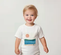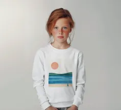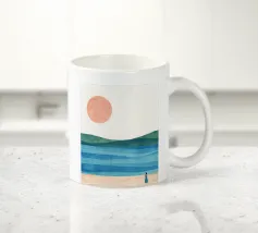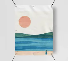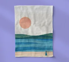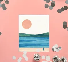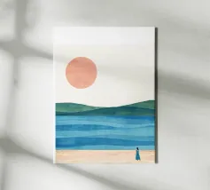 Una donna cammina da sola su una soffice spiaggia sabbiosa, il sole tramonta all'orizzonte in un caldo colore arancione e l'acqua azzurra lo lambisce dolcemente. Il dipinto esprime un senso di pace interiore e di connessione.