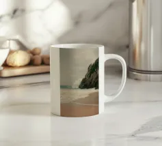 Una spiaggia con montagne si estende lungo la riva, dove la sabbia dorata incontra le dolci onde e le cime torreggianti si ergono sullo sfondo, fondendo mare e terra in una vista mozzafiato.