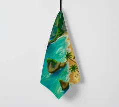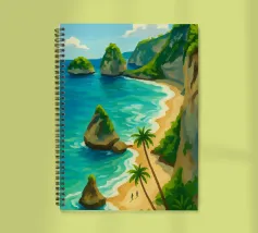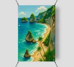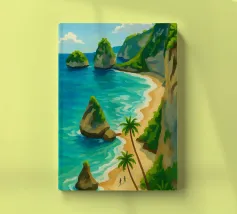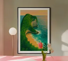 Portate l'essenza del paradiso nel vostro spazio con questa vivace opera d'arte tropicale da parete. Ispirata alle drammatiche scogliere costiere di Bali, questa opera d'arte presenta acque turchesi, spiagge sabbiose e iconiche formazioni rocciose, il tutto reso in un colorato dipinto in stile gouache. Perfetto per aggiungere un'atmosfera fresca e naturale alla casa, all'ufficio o alla casa al mare.