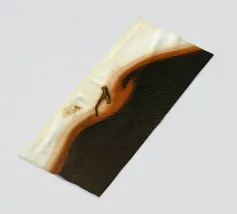La sabbia vulcanica liscia scintilla sotto la luce del sole come piccoli pezzi di ossidiana. Le onde rotolano dolcemente sulla riva, lasciando dietro di sé una lucentezza argentata prima di ritirarsi nell'acqua profonda. L'atmosfera è misteriosa e ipnotica, come se la spiaggia contenesse storie antiche trasportate dal vento e dal mare.